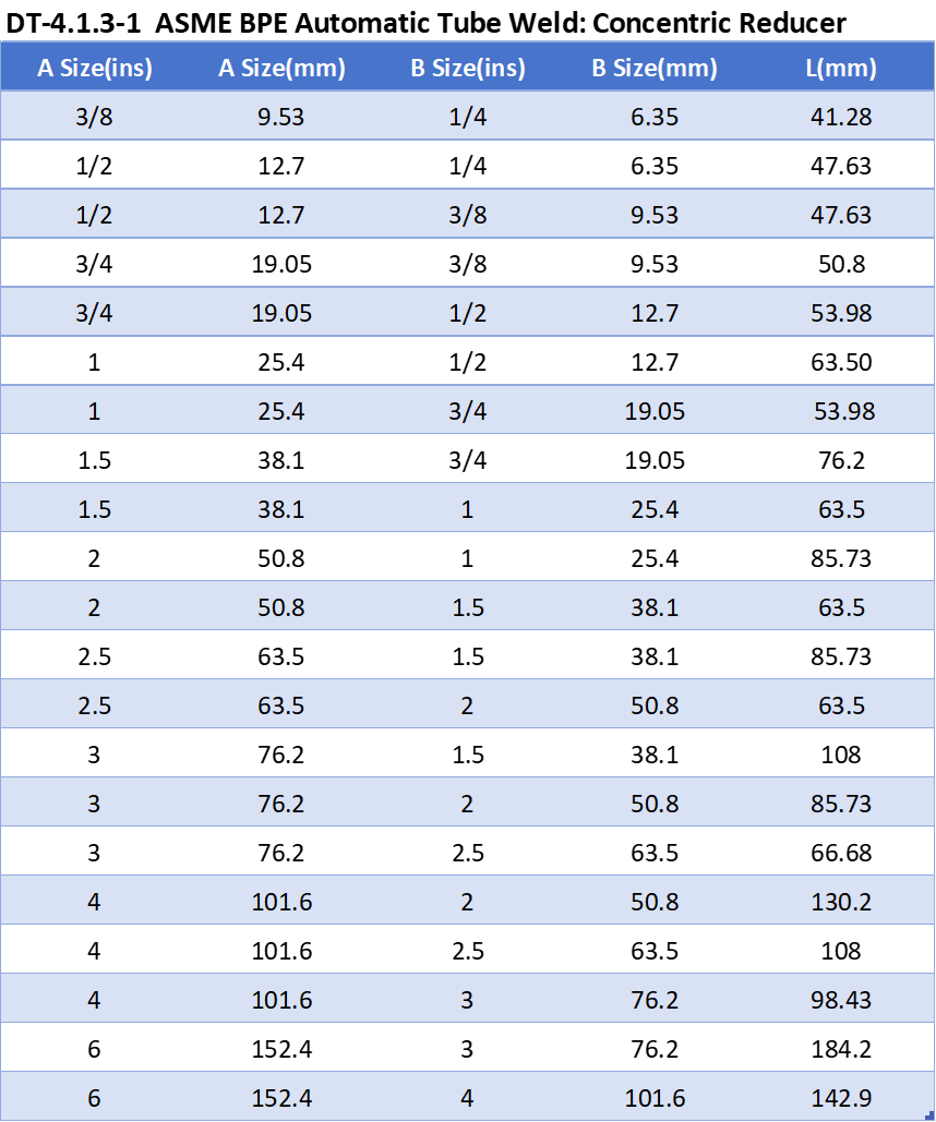 WSG Sanitary Stainless Steel SS316L Biopharm Concentric Reducer ASME BPE DT-4.1.3-1 SF4 Automatic Tube Weld: Concentric Reducer Type B